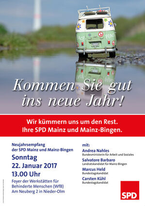 Wir freuen uns, dass neben Salvatore Barbaro, unserem Kandidaten für die Landratswahl im Kreis Mainz-Bingen, und unseren beiden Kandidaten für die Bundestagswahl, Marcus Held und Carsten Kühl, mit Andrea Nahles, Bundesministerin für Arbeit und Soziales, auch ein sozialdemokratisches Mitglied der Bundesregierung ihr Kommen bereits zugesagt hat. Der Neujahrsempfang findet statt am